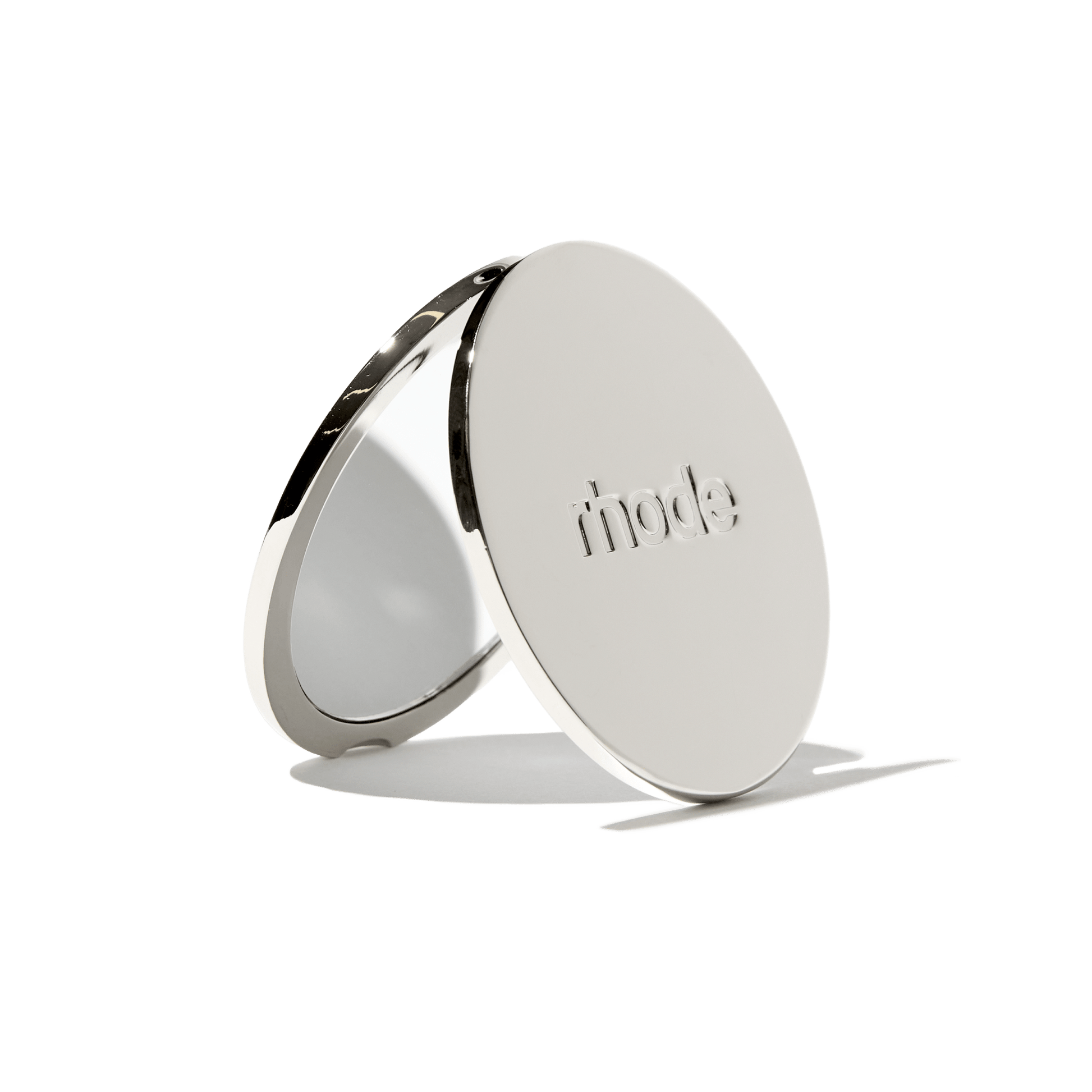The signature rhode mirror to take on the go. Slip our sleek metal compact into your purse or makeup bag for lip and blush touch-ups anytime, anywhere. Size: 2.75" wide / 0.25" deep.
